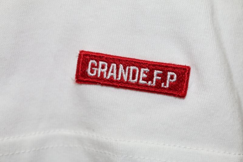 グランデ.エフ.ピー.定番.ヘビーウエイトタイプのコットン素材を使用し、左胸にサッカーボールをイメージした六角形のシリコン素材のワッペンを施し、背中に、ニューGRANDE.F.Pメッセージ入りのフェイクスウェードワッペンを、右袖には、GRANDE.FP.刺繍ワッペンを、さりげなく施した、アパレルラインのニュー定番Tシャツ。